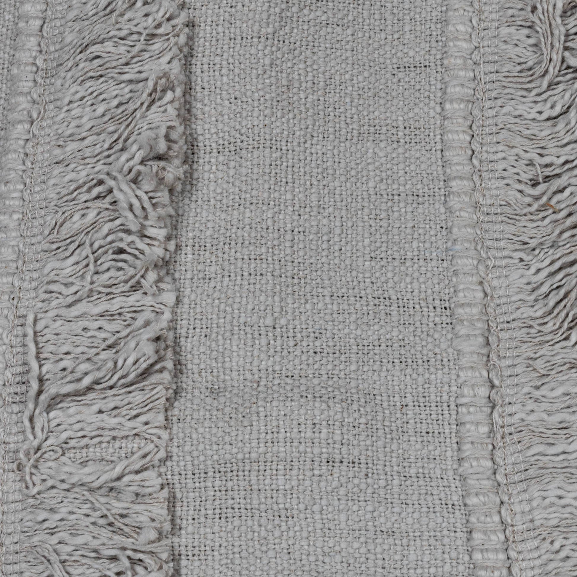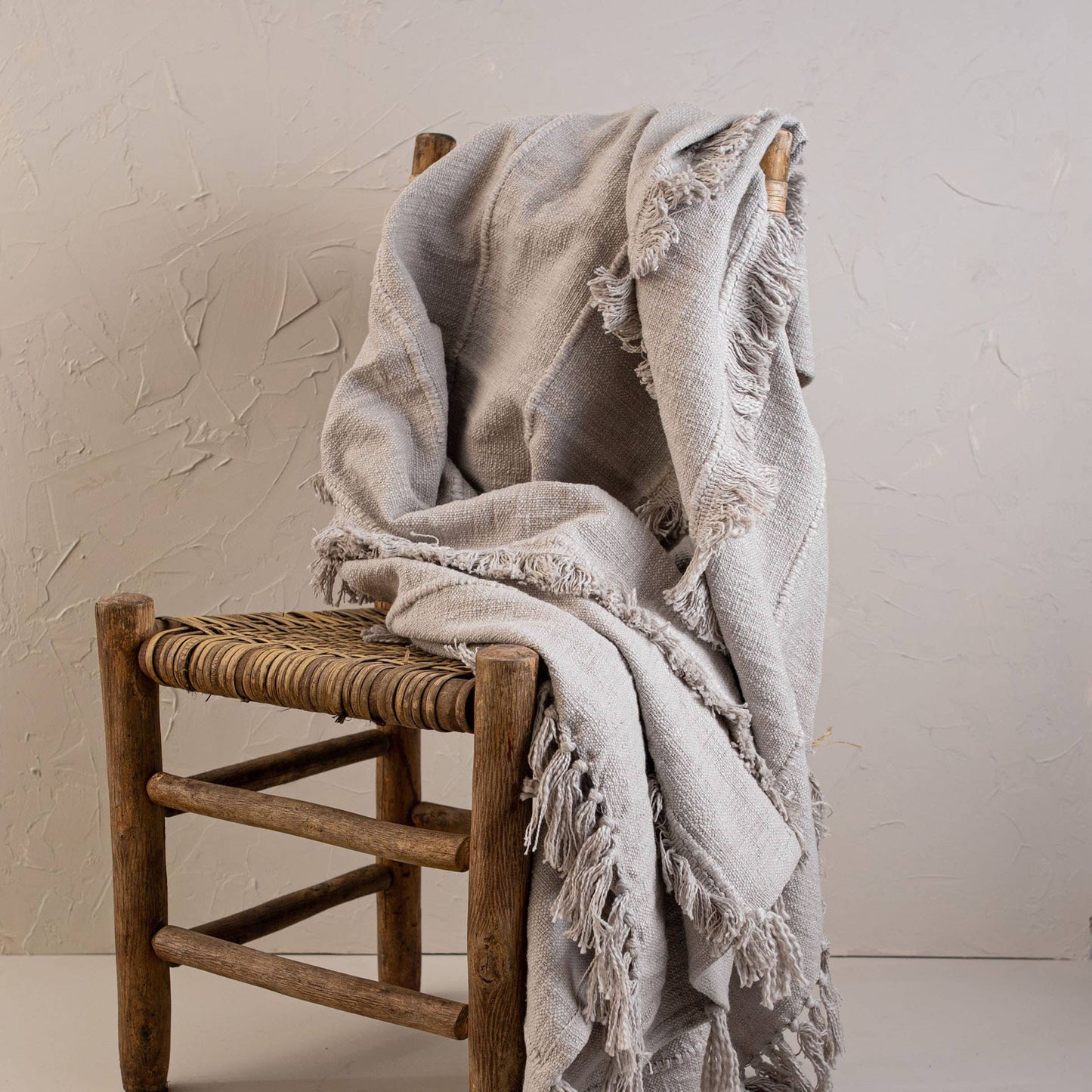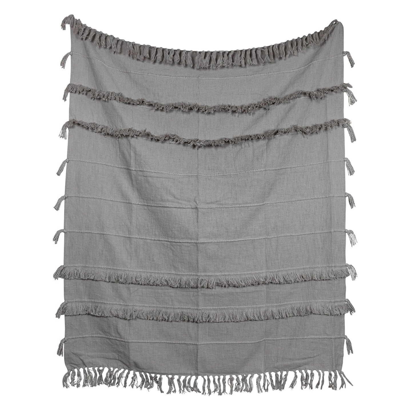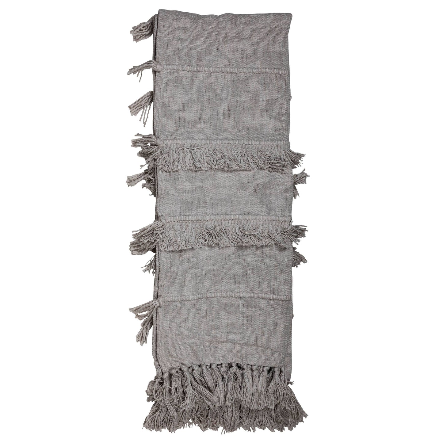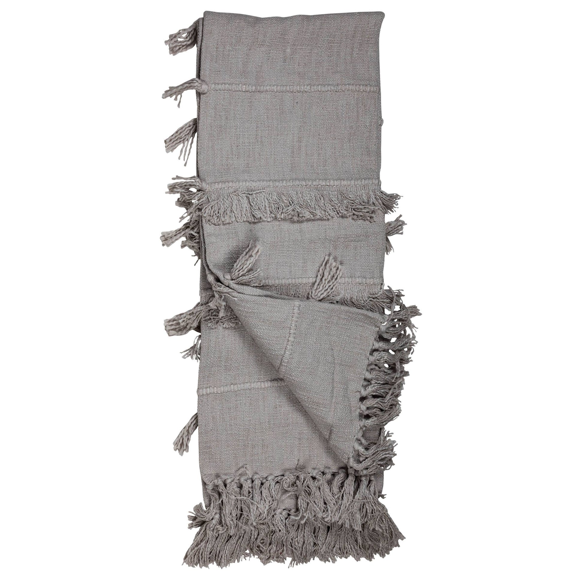An easy, casual addition for any space. Hand-woven by artisans in India, this throw blanket features soft textural stripes with a fringe trim and playful tassels. Made with soft, slub cotton in a light gray color.