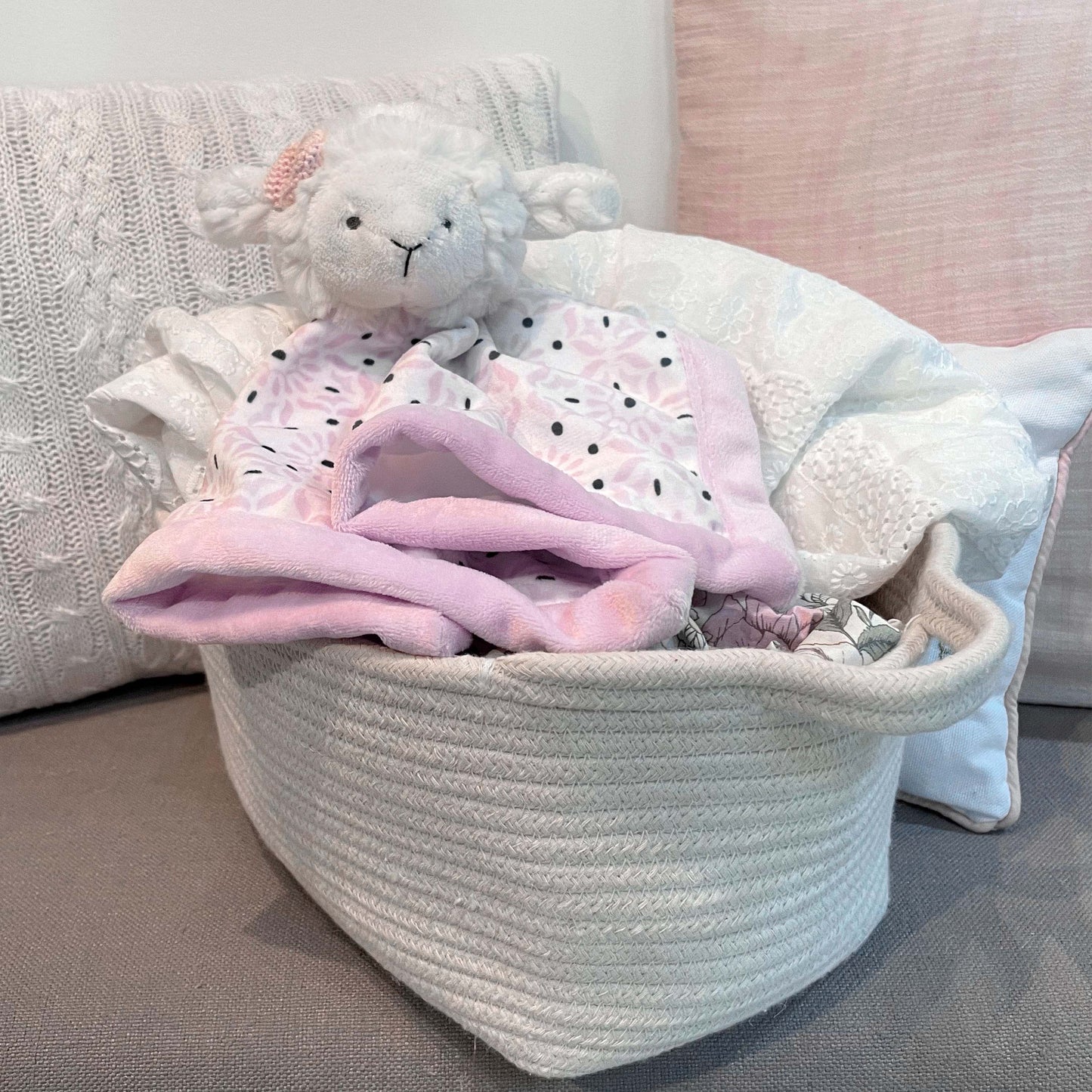 A beautiful accessory for any baby nursery, the Fiori stuffed toy is an adorable fluffy plush lamb in ivory with a pink and charcoal madellion belly and a pink bow. Sure to become one of baby's favorite friends!