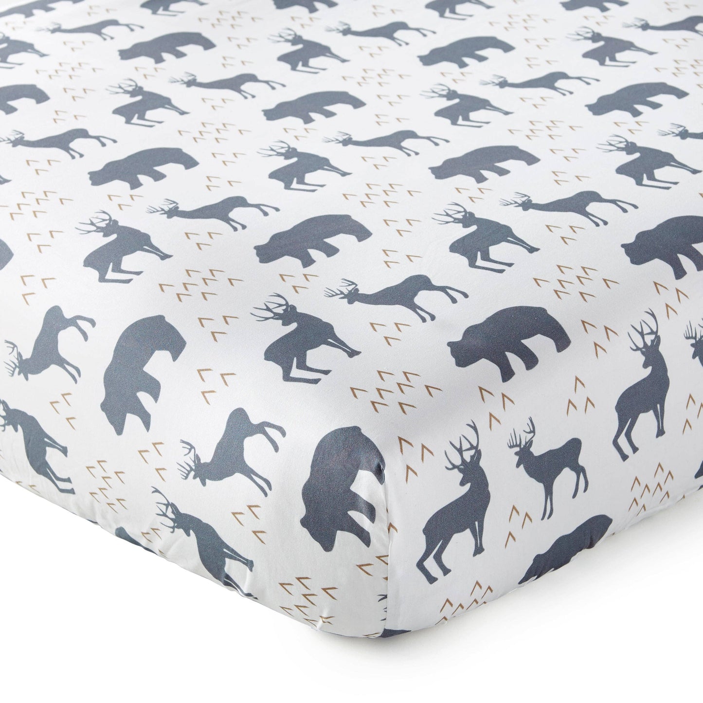 Your baby will rest peacefully on the Logan Fitted Crib Sheet. This fitted sheet is covered in bears and deer in navy on a white ground. This 100% Cotton fitted sheet is gentle on your baby's soft skin and features elastic edges so that it fits snuggly around a standard-size crib mattress, staying in place until you remove it for cleaning. This sheet will transform your nursery, adding fun and adventurous accents. Enjoy for years to come!