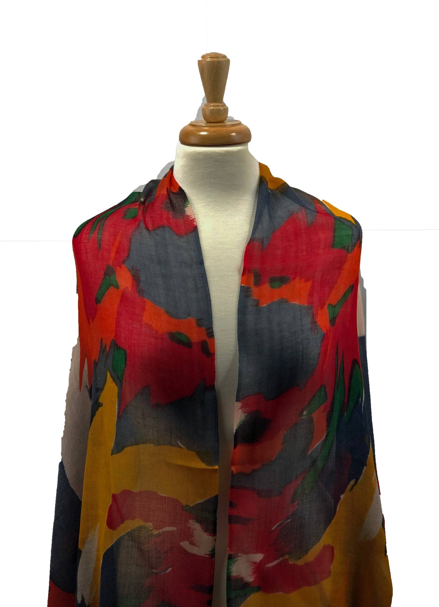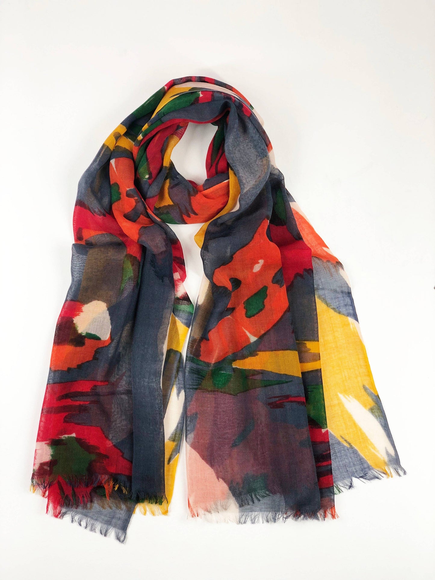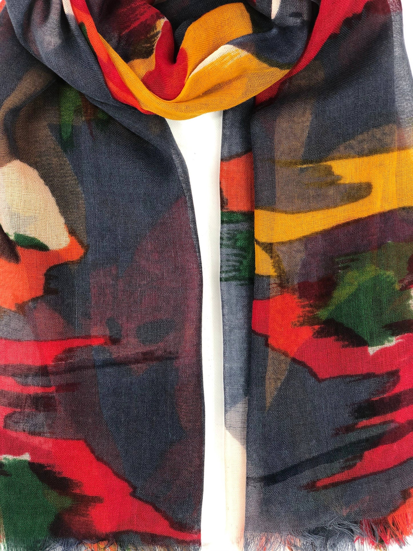 This gorgeous scarf boasts a stunning abstract design, delicately screen-printed onto a soft and warm blend of 90% Merino wool and 10% silk. The gauze weave allows for breathability and comfort, making it the perfect accessory for any outfit. Size: 77"/28".