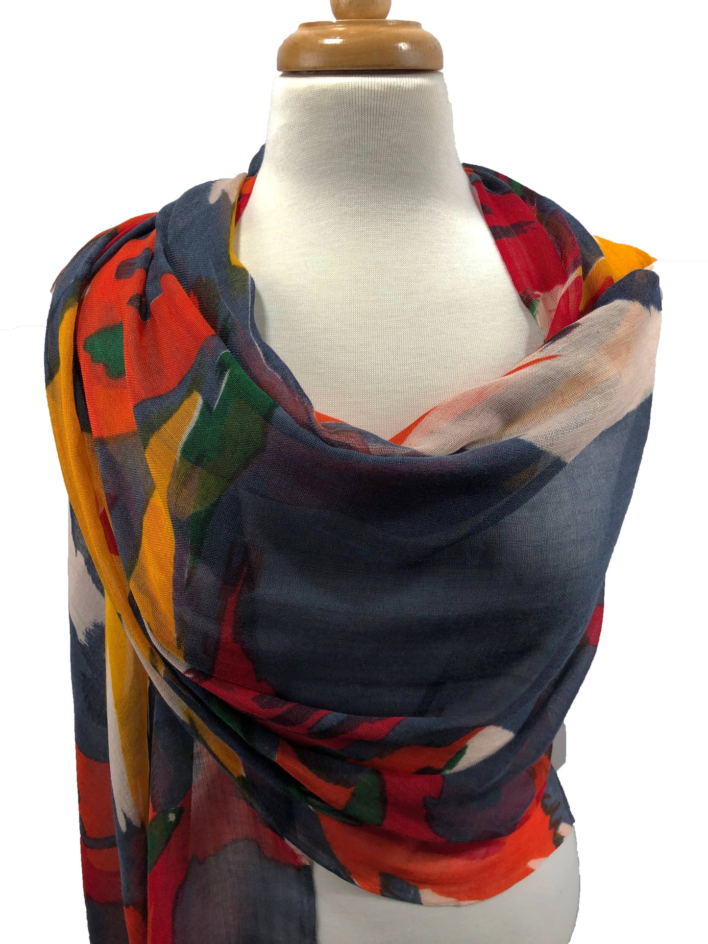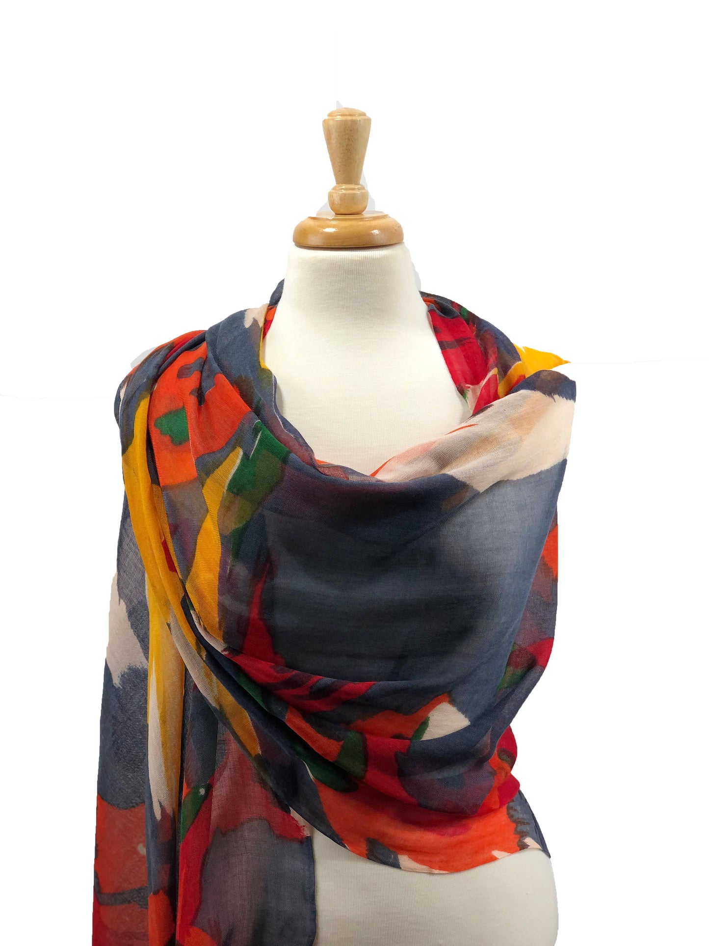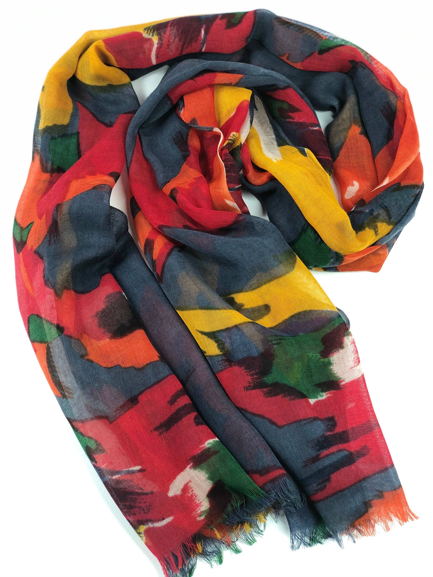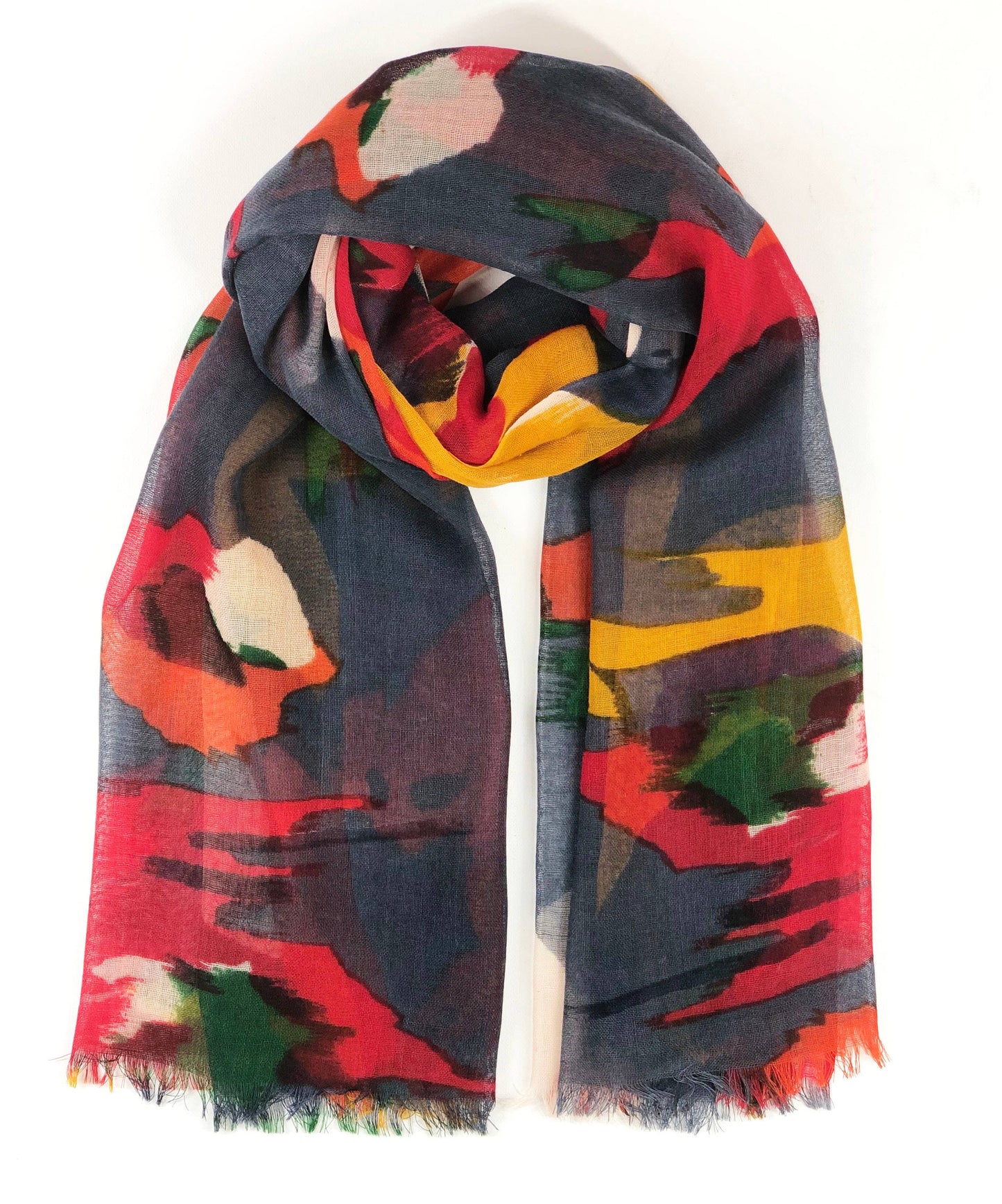 This gorgeous scarf boasts a stunning abstract design, delicately screen-printed onto a soft and warm blend of 90% Merino wool and 10% silk. The gauze weave allows for breathability and comfort, making it the perfect accessory for any outfit. Size: 77"/28".