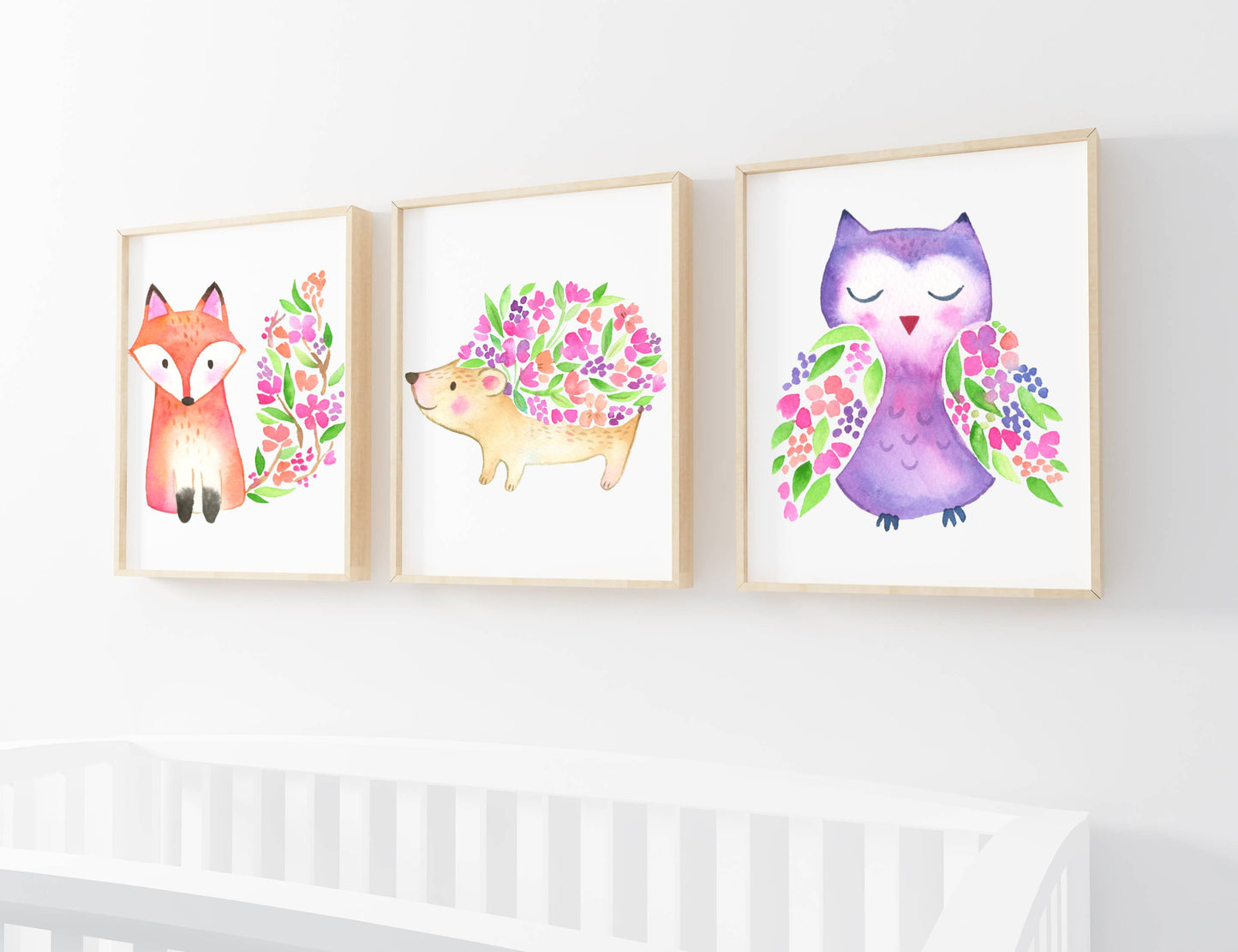 Set of 3 Nursery Wall Art Prints Floral Woodland Collection